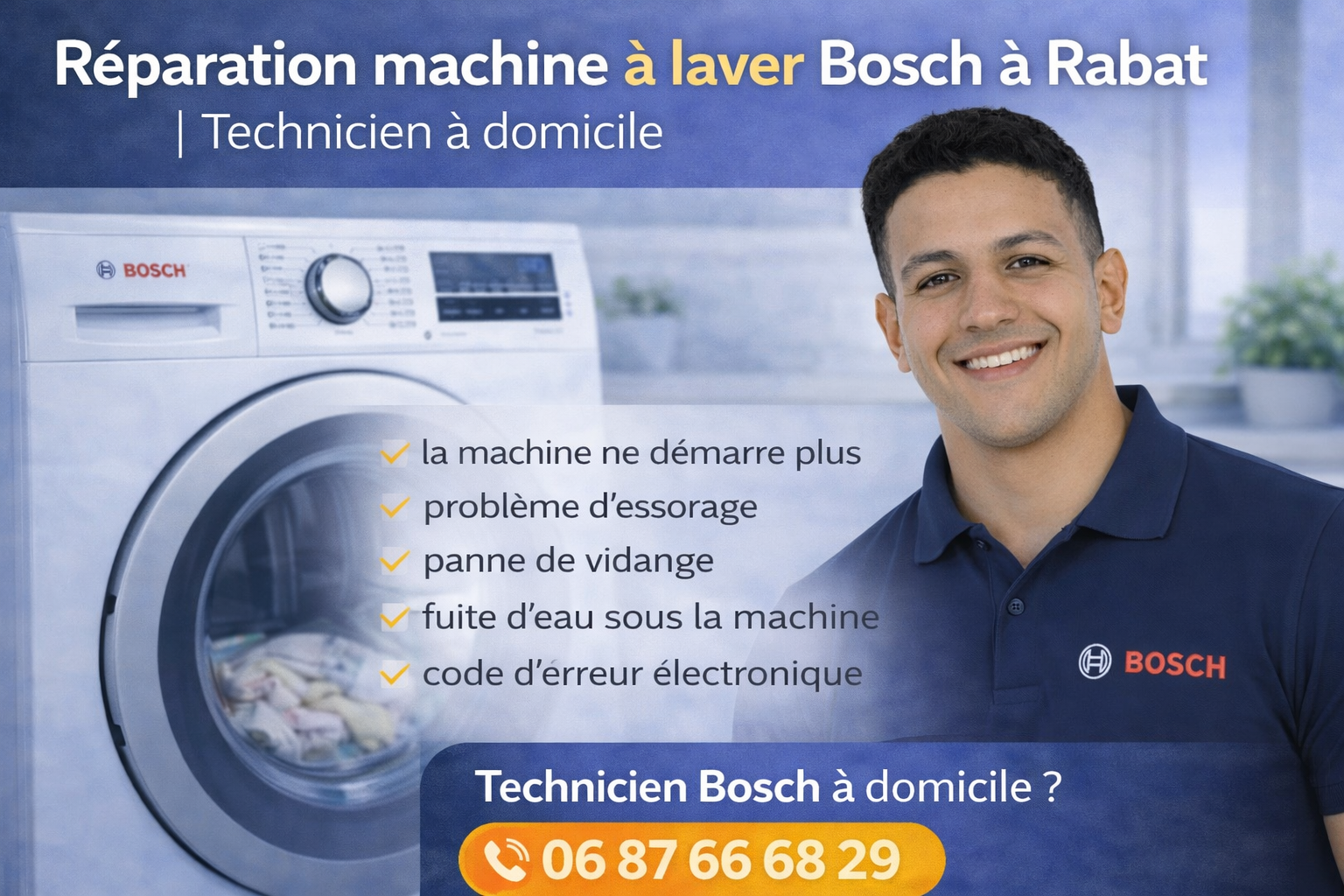 Pour toute demande de réparation machine à laver Bosch à Rabat, un technicien à domicile est disponible.📞 Téléphone : 06 87 66 68 29