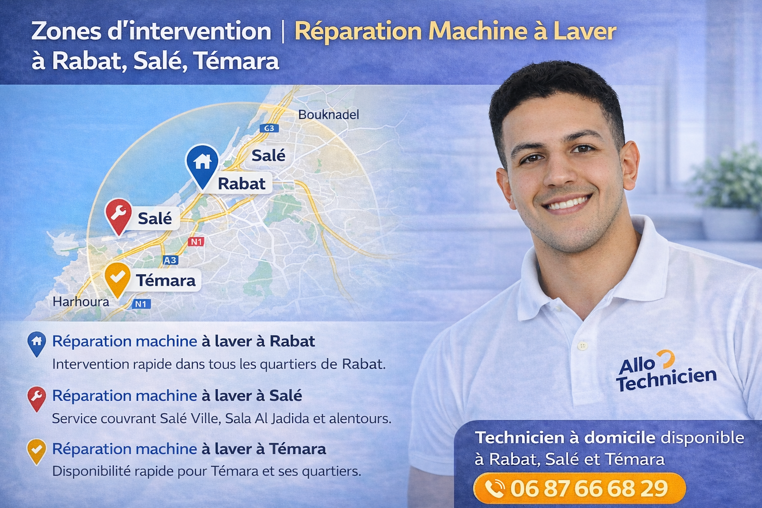 Notre service de réparation machine à laver à domicile est disponible dans plusieurs zones pour assurer une intervention rapide et efficace. Nous couvrons principalement Rabat, Salé et Témara, avec un technicien qui se déplace مباشرة chez vous.Cette organisation permet de réduire le temps d’attente et de proposer une solution adaptée à chaque panne rencontrée.