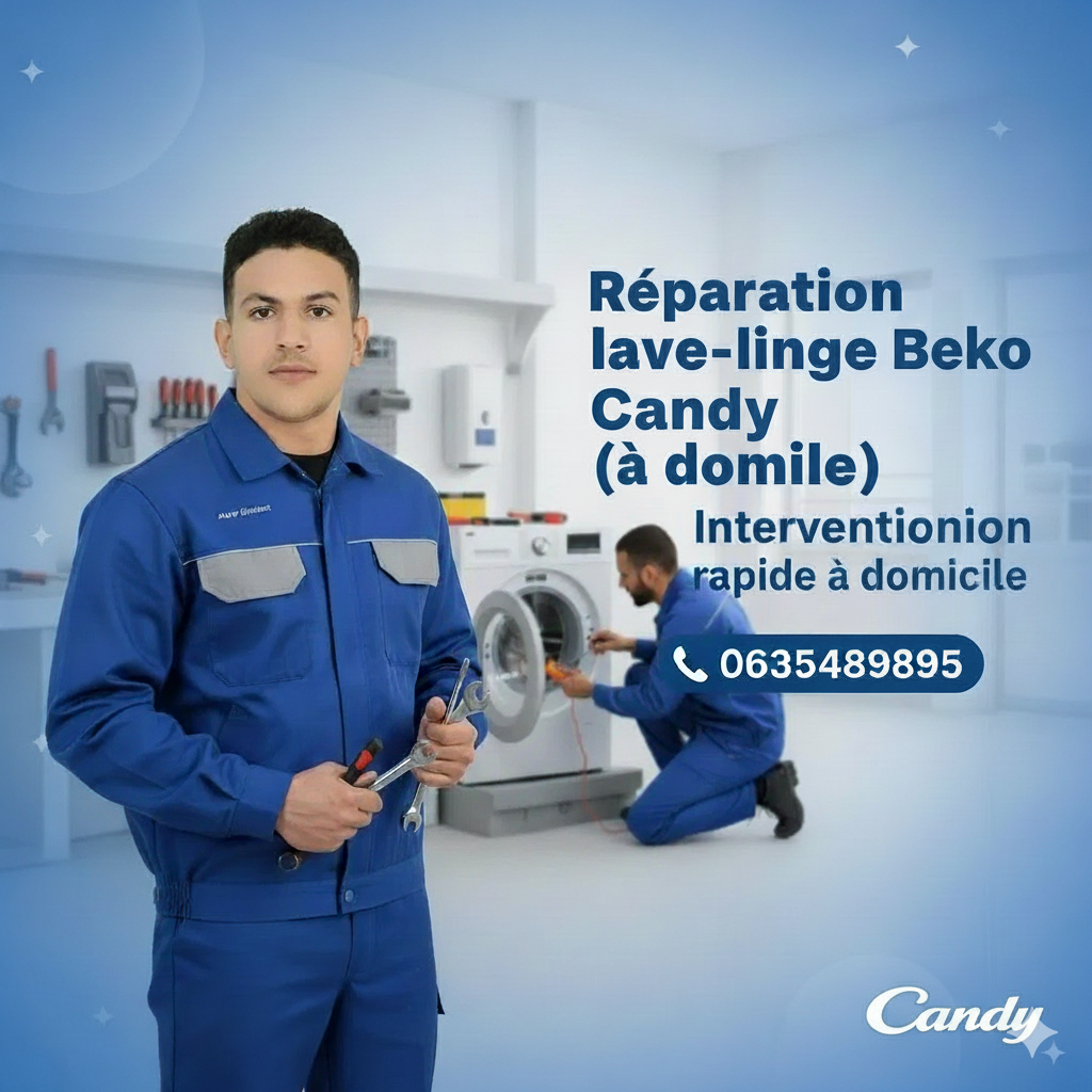 Lave-linge Candy لا يفرّغ، ما كيسورش، كيبان code erreur أو الهُبلوت مسدود؟ كنجيّوك حتى للدار، تشخيص سريع وdevis واضح، وإصلاح بضمان.